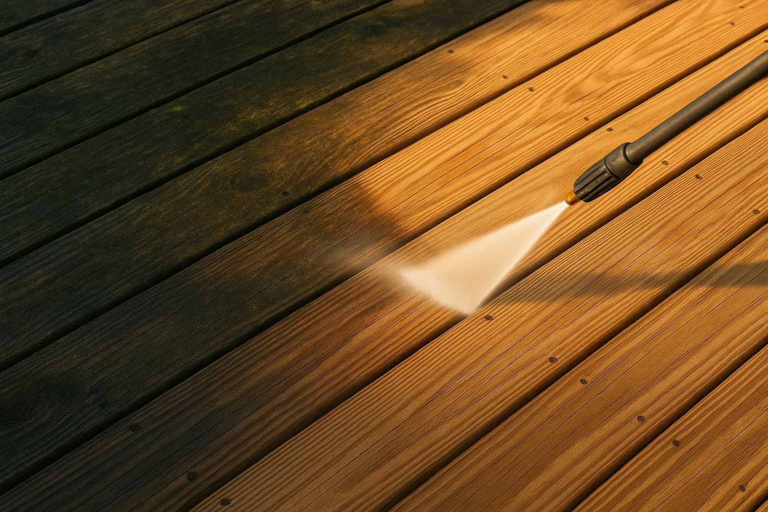 A power washer nozzle spraying water onto a wooden deck, cleaning the surface.